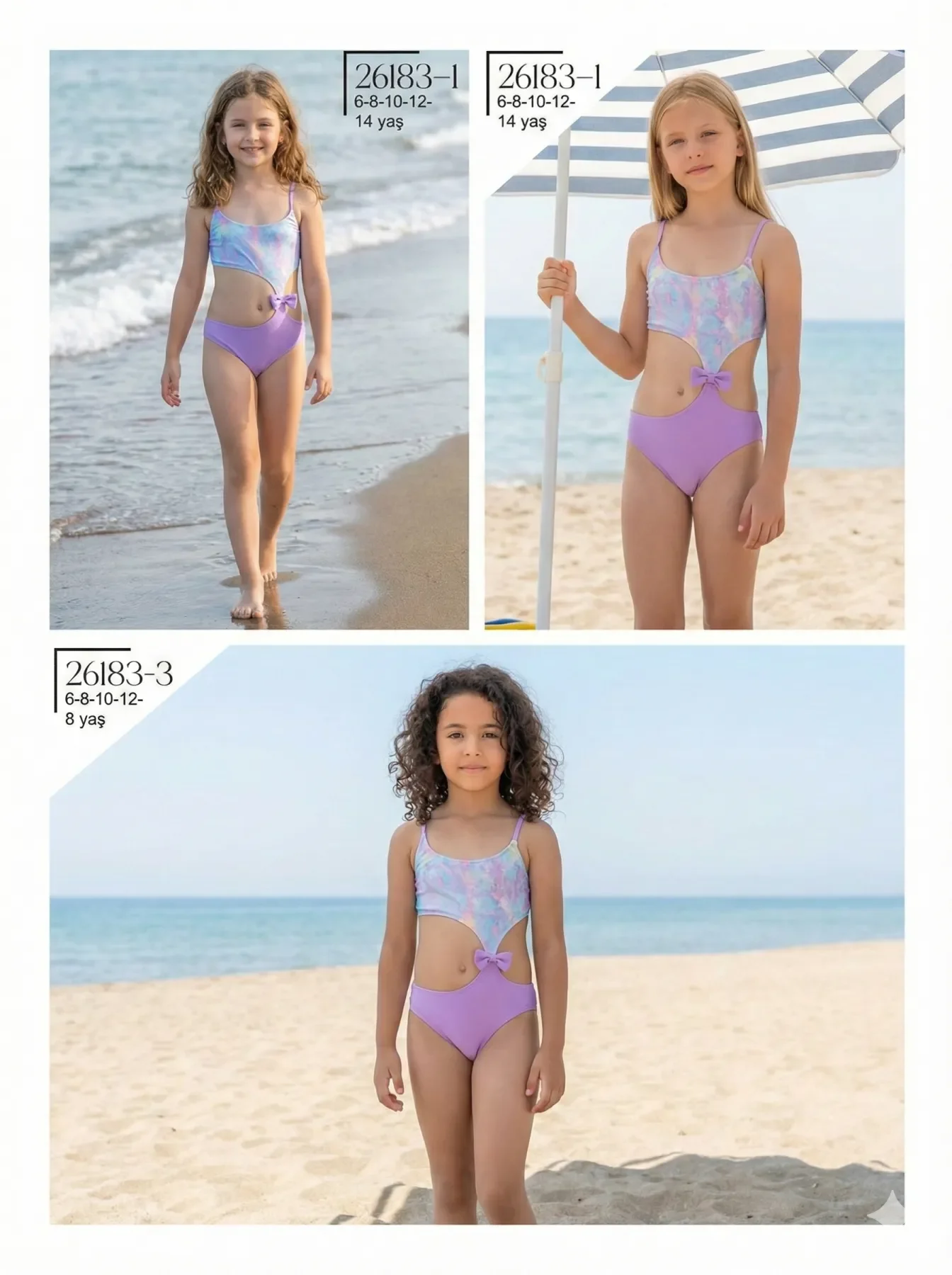 Toptan 2026 Lila Desenli Fiyonk Detaylı Kız Çocuk Mayo - İstanbul Mayo