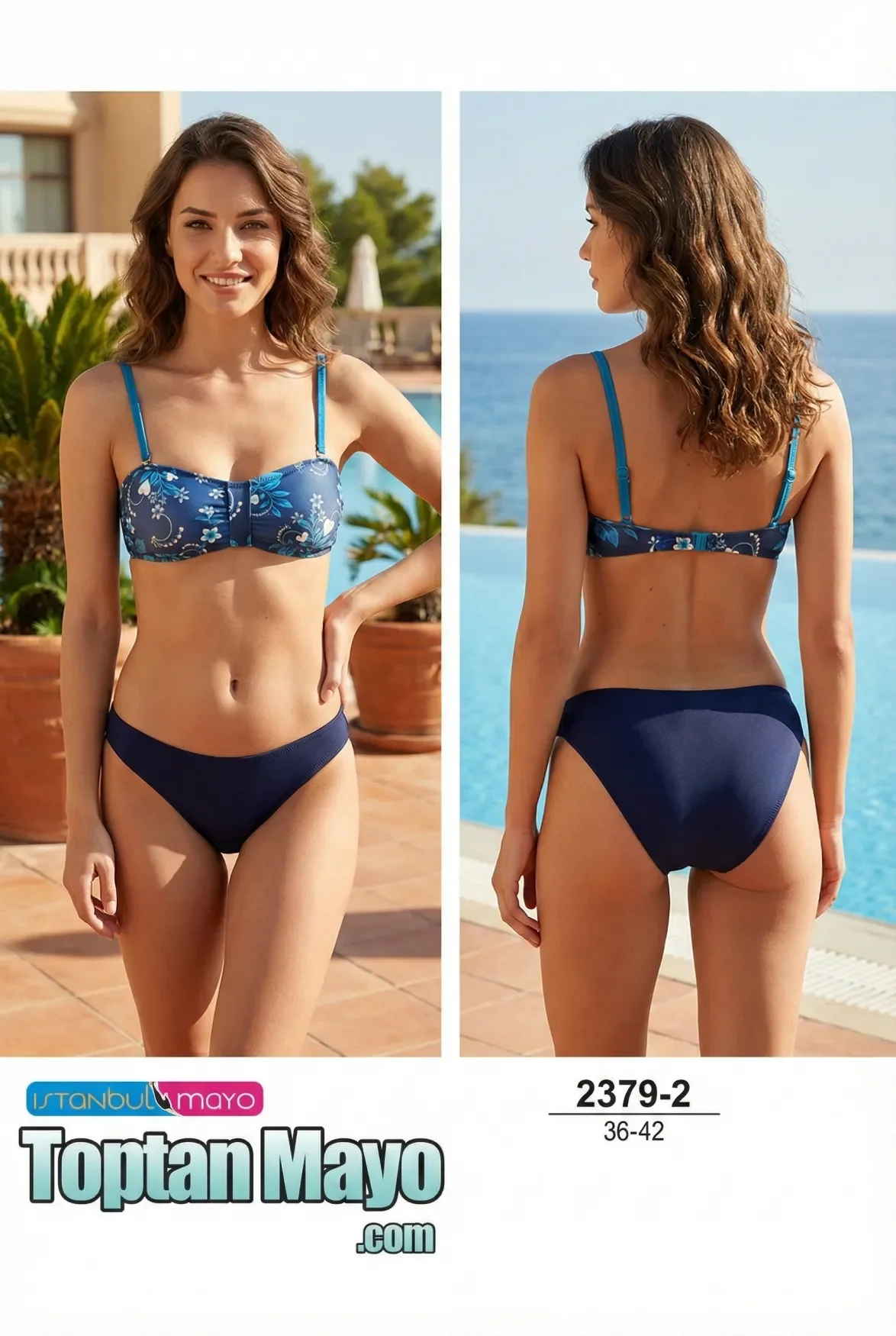 ![]() | Plaj modasında mavinin ferahlığı, zarif çiçek desenleriyle bu modelde hayat buluyor. Straplez/bando formundaki üst parça, omuz askılı yapısı ve göğüs ortasındaki büzgü detayıyla hem güvenli hem de şık bir kullanım sunar. Mavi tonlarının hakim olduğu desenli üst, düz lacivert ve sabit kesim alt parçayla mükemmel bir uyum sergiler. 36-42 beden aralığıyla üretilen bu model, mağazanızın "hem şık hem konforlu" arayışındaki müşterileri için ideal bir seçenektir. |