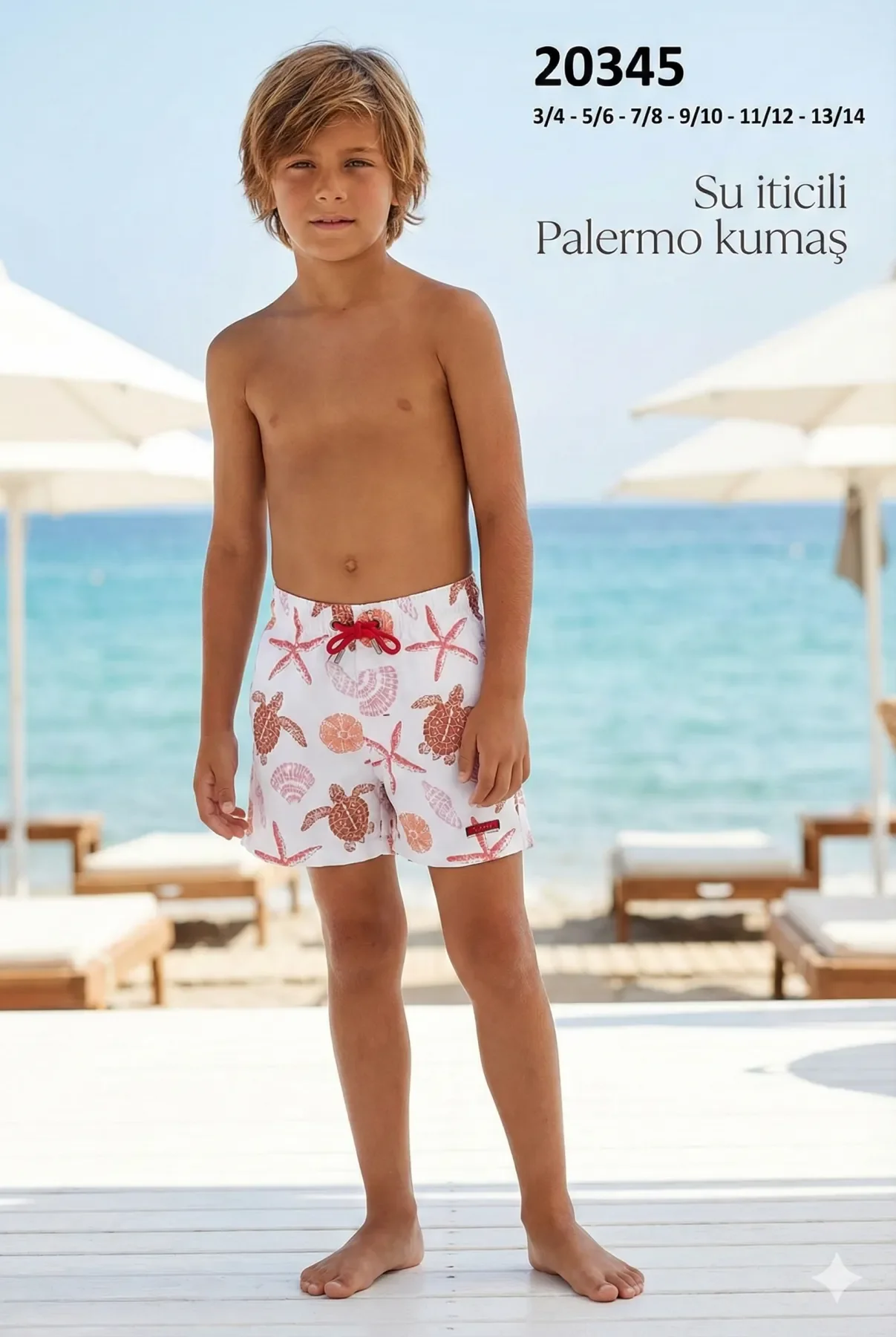 Toptan erkek çocuk deniz şortu, içi file astarlı, beli lastikli ve bağcıklı yapısıyla çocuklar için rahat kullanım sunar. Su iticili ve hızlı kuruyan Palermo kumaş ile üretilmiştir.