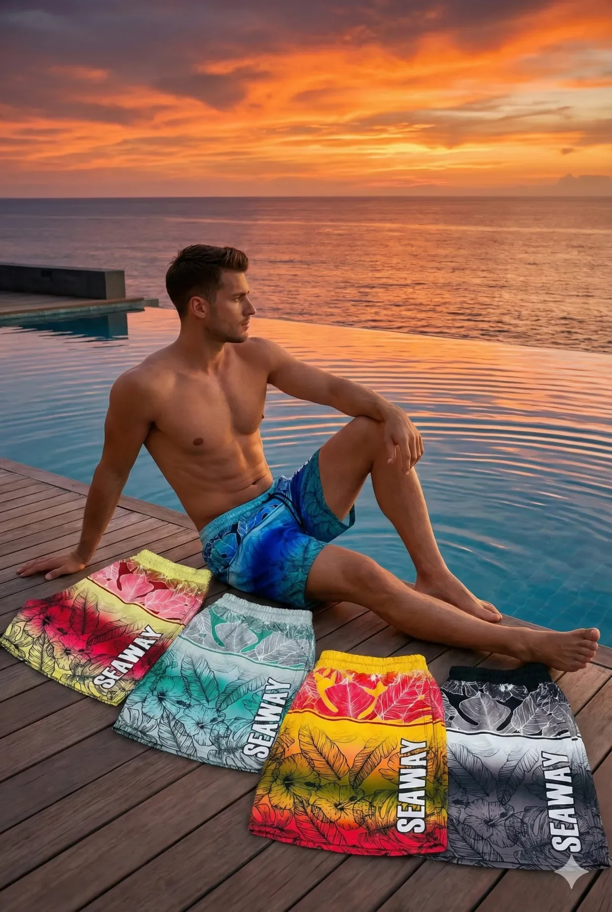 Plajların En Enerjik Tasarımı Canlı renk geçişleri (degrade) ve büyük boyutlu tropikal yaprak desenleriyle dikkat çeken bu model, tatil modunu tam anlamıyla yansıtıyor. Yan kısımdaki dikey "SEAWAY" tipografik baskısı, ürüne sportif ve modern bir marka algısı katıyor. Özellikle genç ve dinamik hedef kitleye sahip butik ve mağazalar için ideal bir seçenektir. Ürün Özellikleri: