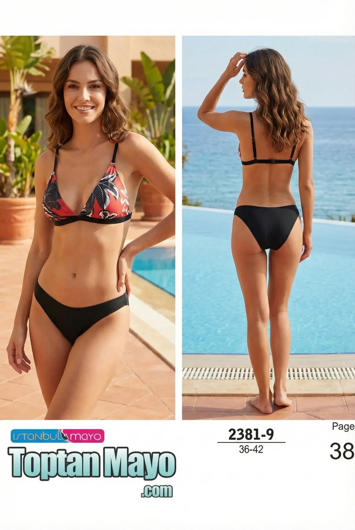 toptan bikini, kırmızı bikini, tropikal desenli bikini, yaprak desenli mayo, omuz askılı bikini, ayarlanabilir askılı, siyah altlı bikini, 2026 yaz sezonu, toptan plaj giyim, istanbul mayo, 2381-9, toptanmayo