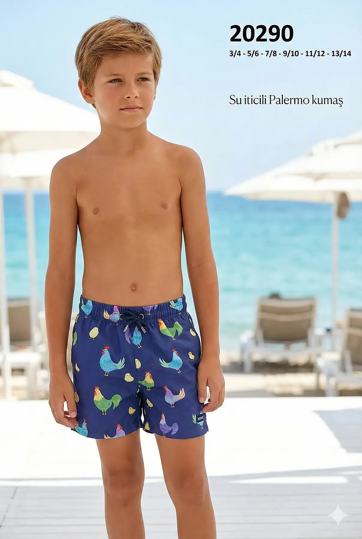 Yaz sezonunda mağazanızın en çok ilgi gören parçalarından biri olmaya aday, eğlenceli horoz ve civciv desenlerine sahip lacivert erkek çocuk deniz şortu. Hem canlı renkleriyle çocukların dikkatini çeker hem de yüksek kumaş kalitesiyle ebeveynlerin güvenini kazanarak hızlı satış imkanı sunar.