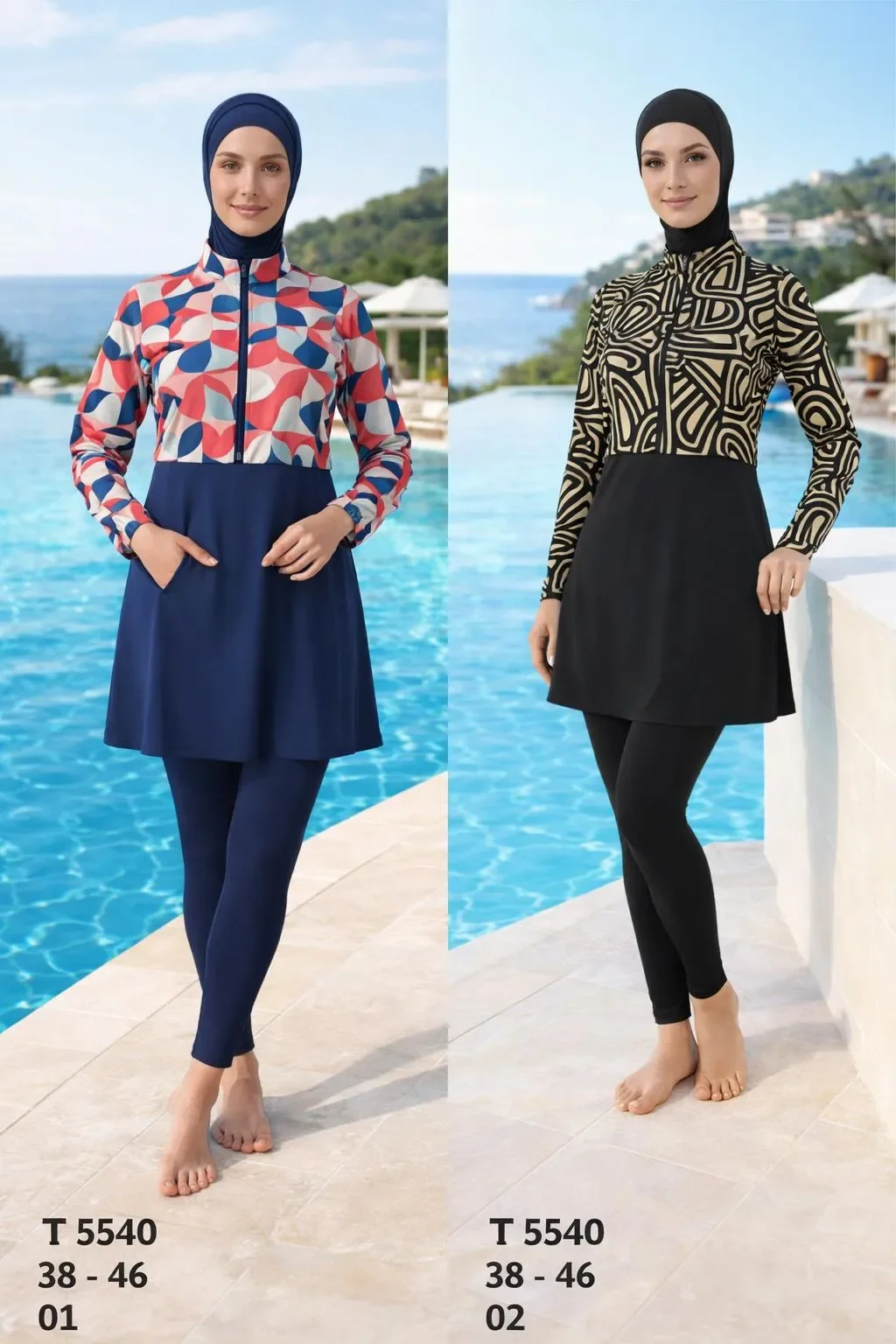 Premium segment koleksiyonlara uygun uzun kesimli ve fermuarlı yeni sezon tesettür mayo modelidir. Desenli tasarımı ile üst segment mağaza satışlarına hitap eder.