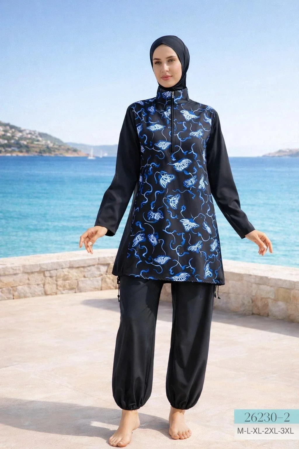 Yeni sezonun en çok tercih edilen tam kapalı tesettür mayo modellerinden biri olan bu ürün, siyah zemin üzerine modern mavi desenleriyle toptan satışta dikkat çeken bir seçenektir.
